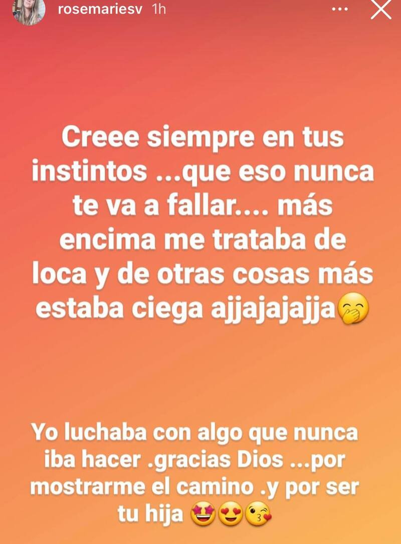 Incluso, se animó a entregar una recomendación a sus seguidores. "Cree siempre en tus instintos…que eso nunca te va a fallar…Más encima me trataba de loca y de otras cosas más, estaba ciega…Yo luchaba con algo que nunca iba a hacer. Gracias Dios por mostrarme el camino y por ser tu hija", complementó.