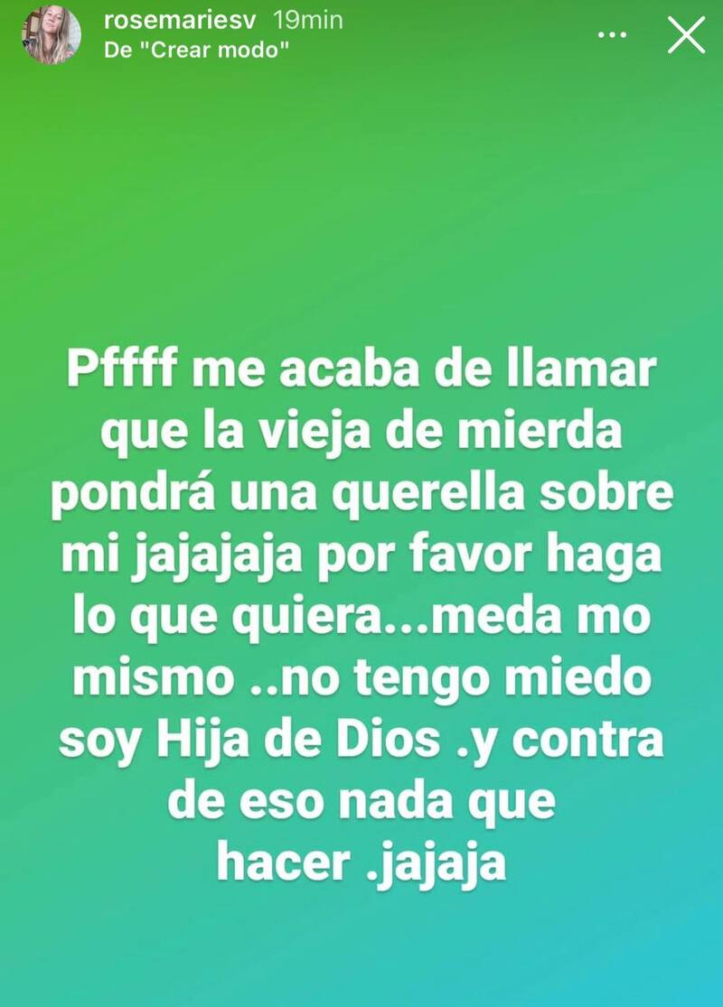 "Pfff, me acaba de llamar la vieja de mier… pondrá una querella sobre mí, jaja. Por favor, haga lo que quiera, me da lo mismo. No tengo miedo. Soy hija de Dios y contra eso nada que hacer, jaja", cerró.