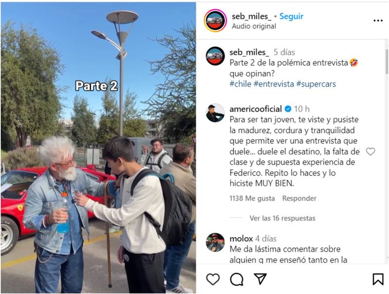 En Instagram y TikTok (@seb_miles_), Sebastián compartió una primera parte de la conversación en que Federico lo interrumpe varias veces para decirle que se le estaba acabando el tiempo de entrevista que presuntamente habría aceptado, es decir, “30 segundos”. Luego, en la segunda tanda, una a una le fue anulando las preguntas con respuestas poco amigables para cerrar con una crítica ante la cámara: “Tení que hacer otro tipo de preguntas, si usted hace preguntas fomes y pencas las respuestas van a ser fomes”, le criticó.