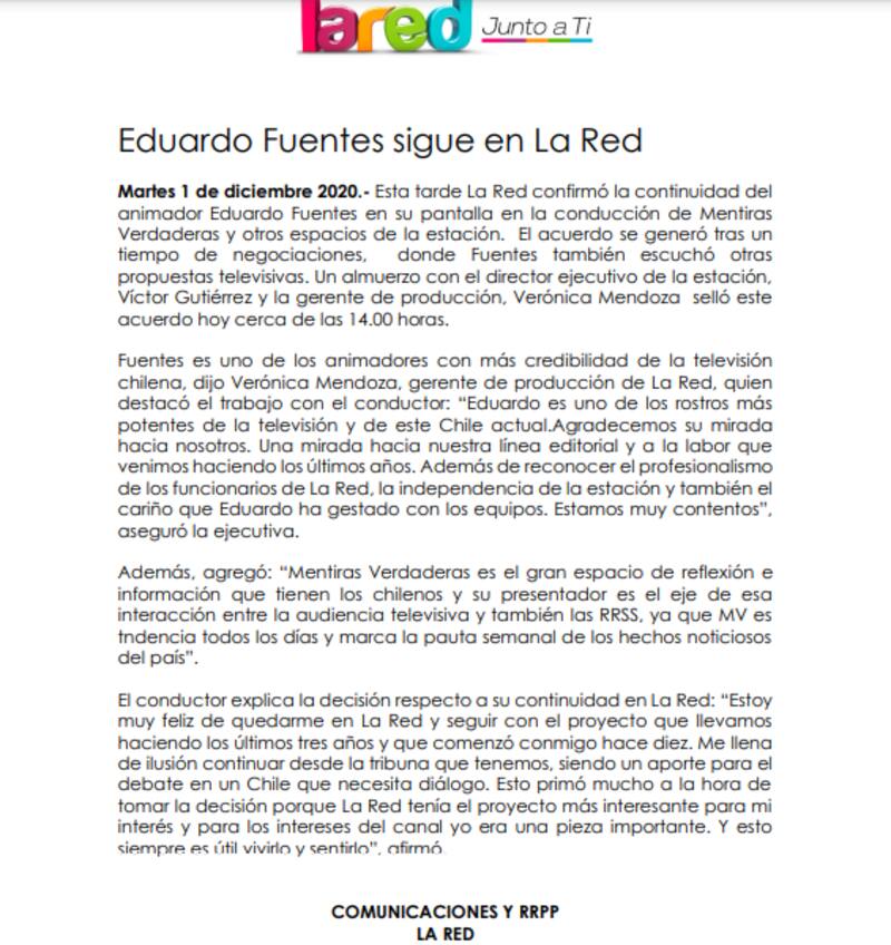 "Esta tarde La Red confirmó la continuidad del animador Eduardo Fuentes en su pantalla en la conducción de Mentiras Verdaderas y otros espacios de la estación. El acuerdo se generó tras un tiempo de negociaciones, donde Fuentes también escuchó otras propuestas televisivas. Un almuerzo con el director ejecutivo de la estación, Víctor Gutiérrez y la gerente de producción, Verónica Mendoza, selló este acuerdo hoy cerca de las 14.00 horas.", dice parte de la información.