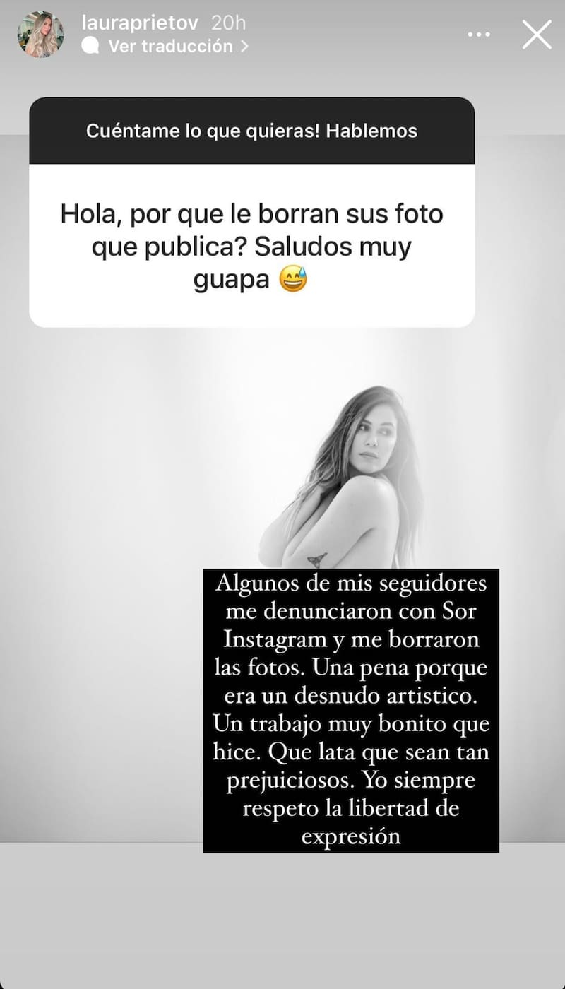 Una particular situación enfrentó durante los últimos días Laura Prieto en sus redes sociales. Esto, luego que Instagram le bajara una fotografía donde aparecía desnuda.