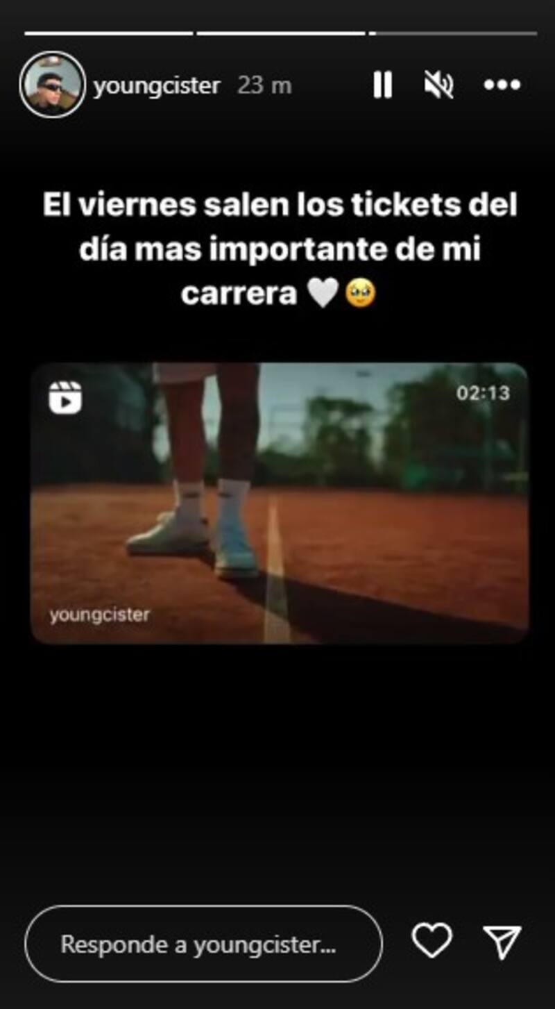 “El viernes salen los tickets del día más importante de mi carrera”, añadió en sus historias posteando el especial video donde anunció el gran show que prepara en el recinto.