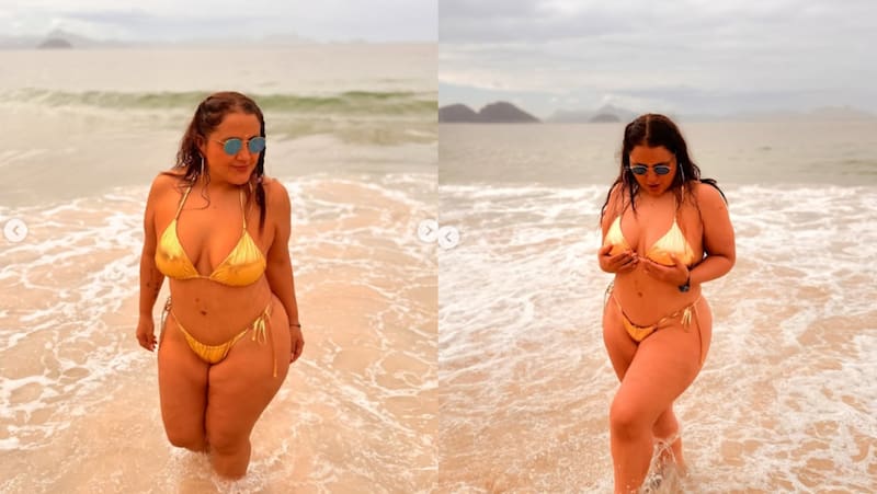 Ahora, en la nueva publicación, Leiva subió una serie de postales con un vestido dorado tomándose un traguito en la playa de Copacabana,