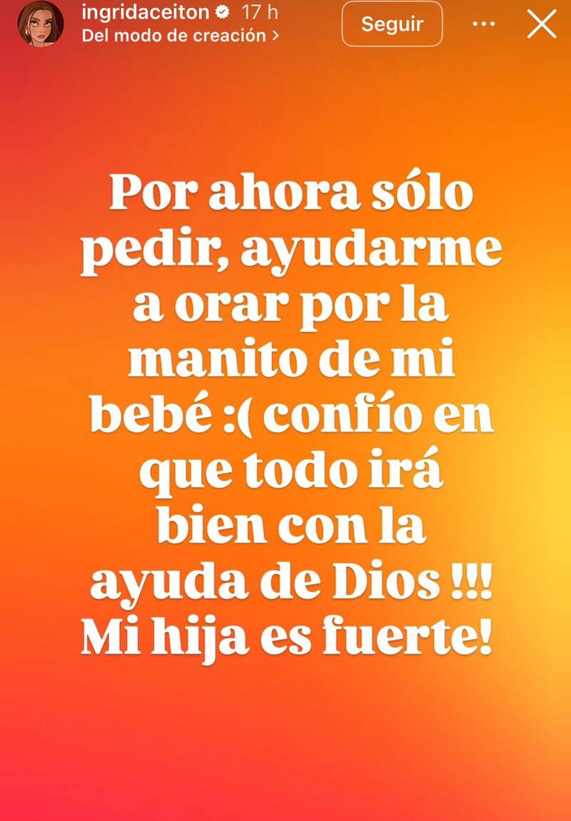 “Por ahora, sólo pedir, ayudarme a orar por la manito de mi bebé. Confío en que todo irá bien con la ayuda de Dios. Mi hija es fuerte”, finalizó.