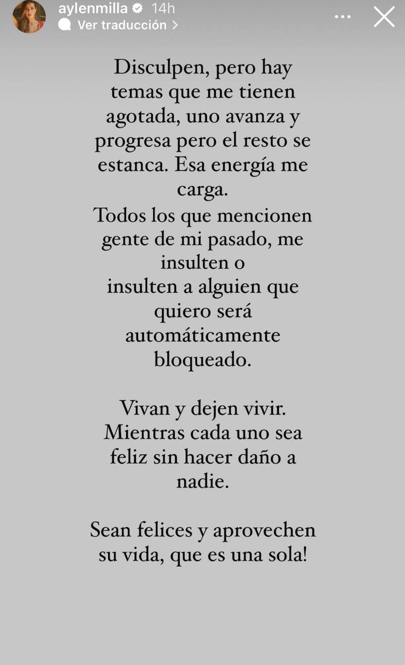 Y en esa misma línea, agregó: “todos los que mencionen gente de mi pasado, me insulten o insulten a alguien que quiero, será automáticamente bloqueado”.