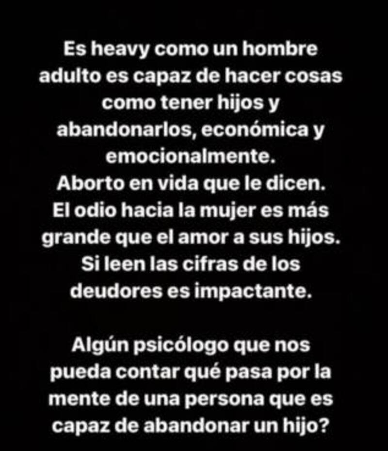 “Es heavy como un hombre adulto es capaz de hacer cosas como tener hijos y abandonarlos, económica y emocionalmente. Aborto en vida que le dicen. El odio hacia la mujer es más grande que el amor a sus hijos. Si leen las cifras de los deudores es impactante”, se desahogó.