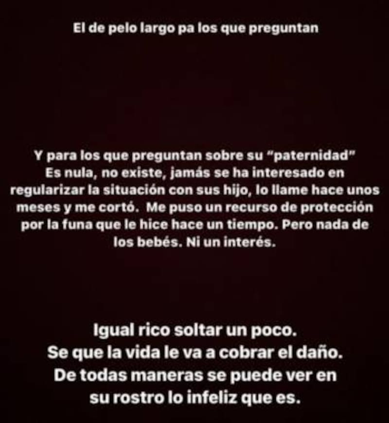 “Y para lo que me preguntan sobre su ‘paternidad’. Es nula, no existe, jamás se ha interesado en regularizar la situación con sus hijos, lo llame hace unos meses y me cortó. Me puso un recurso de protección por la ‘funa’ que le hice hace un tiempo. Pero nada de los bebés. Ni un interés”, acusó.