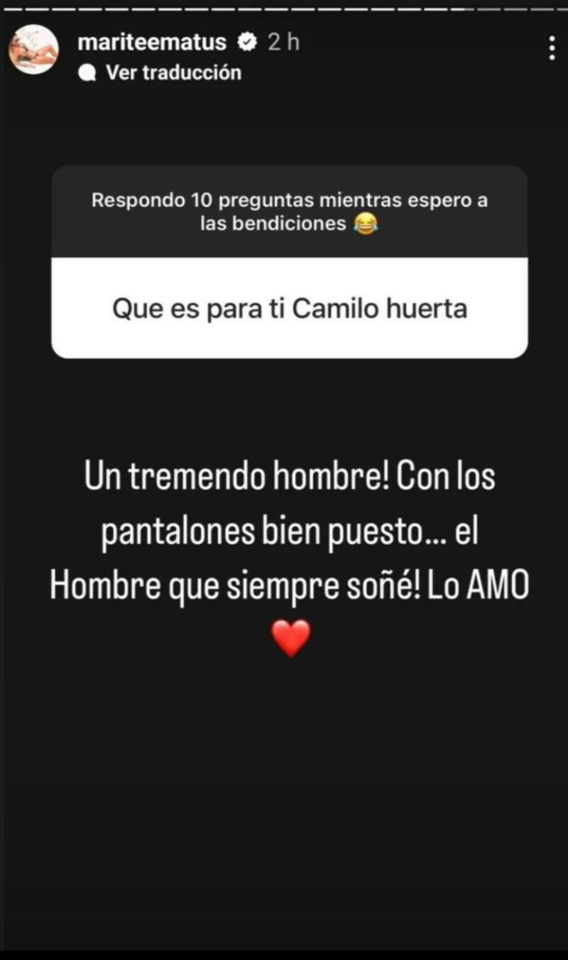 “¿Qué es para ti Camilo Huerta?”, le escribió un seguidor a lo que ella respondió de forma directa. “Un tremendo hombre! Con los pantalones bien puestos… el hombre que siempre soñé! Lo AMO”, afirmó sorprendiendo con sus dichos.