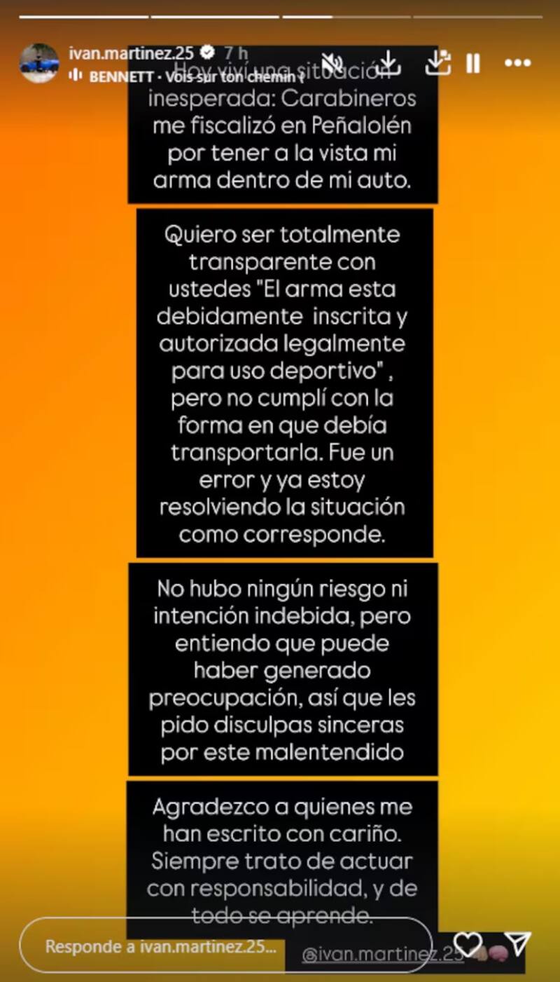En sus redes sociales, el connotado puentealtino abordó el tema y pidió disculpas: “Hoy viví una situación inesperada: Carabineros me fiscalizó en Peñalolén por tener a la vista mi arma dentro de mi vehículo”, comenzó su escrito.