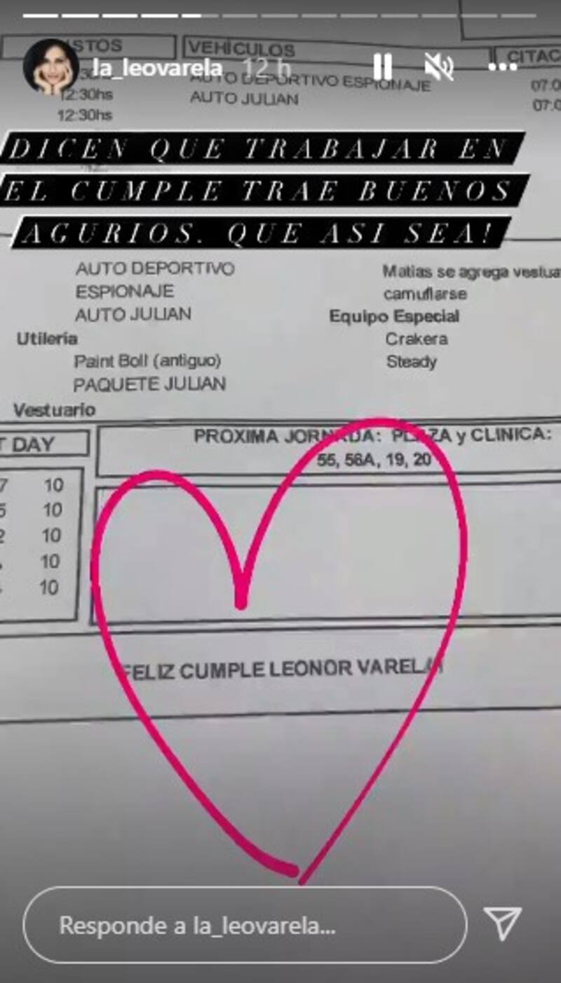 “Dicen que trabajar en el cumple trae buenos augurios. Que así sea!”, agregó en una foto en sus historias de Instagram donde compartió parte de un libreto donde sus compañeros le escribieron un mensaje de cumpleaños.