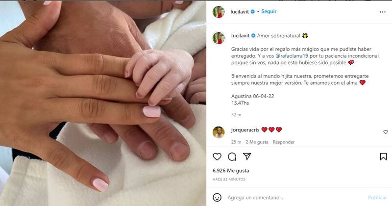 “Magia pura!!!!! Bienvenida Agu… prometemos amarte como nadie junto a tu mamita y tus hermanos que son lo más maravilloso que hay en este mundo @lucilavit @joseolarra #rafita 6/4/2022 los amo”, agregó Rafa Olarra en su cuenta de Instagram publicando la misma foto de la manito de la pequeña y otro registro donde aparecen sus hijos junto a la bebé.