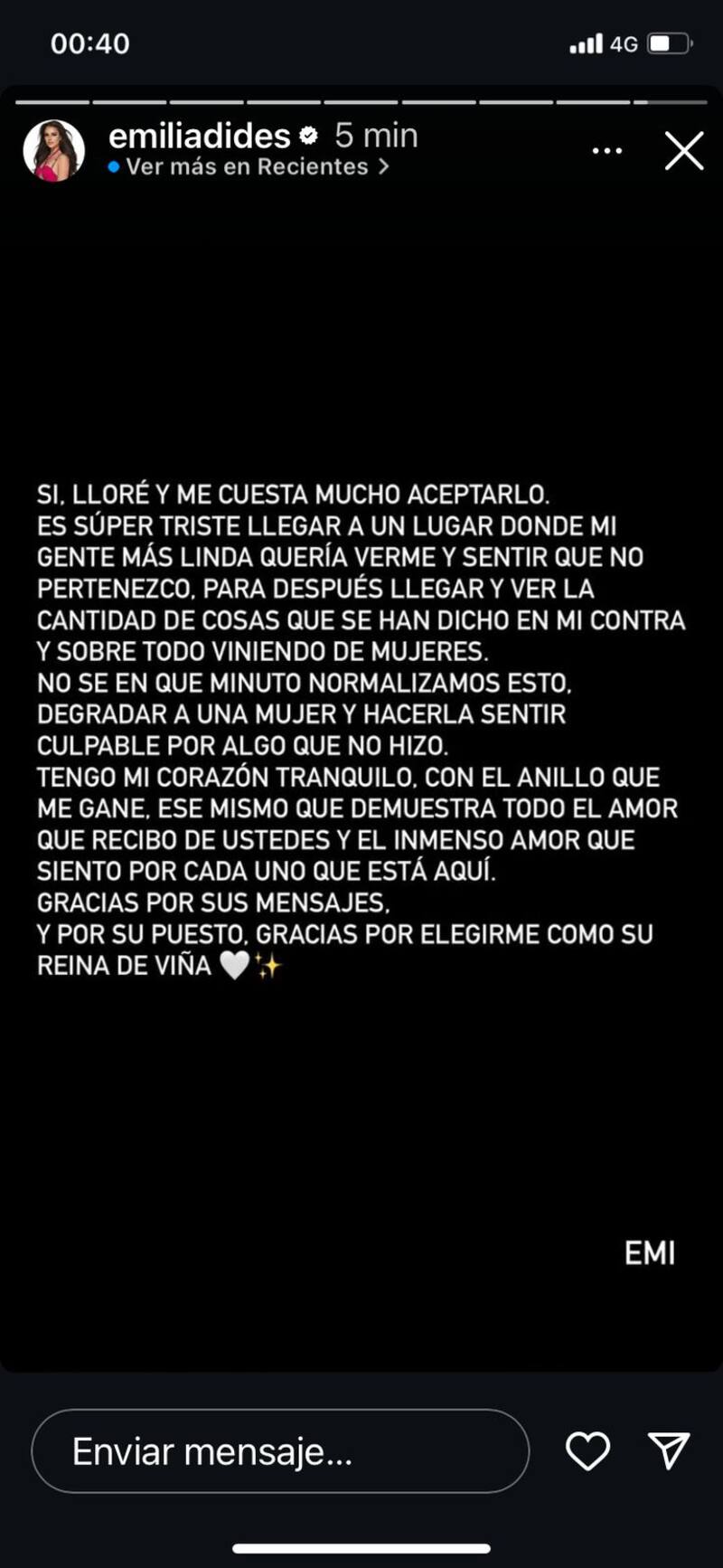 Por Bernardita VillaEmilia Dides explotó tras polémica elección de la Reina del Festival: “Sí, lloré y me cuesta mucho aceptarlo”