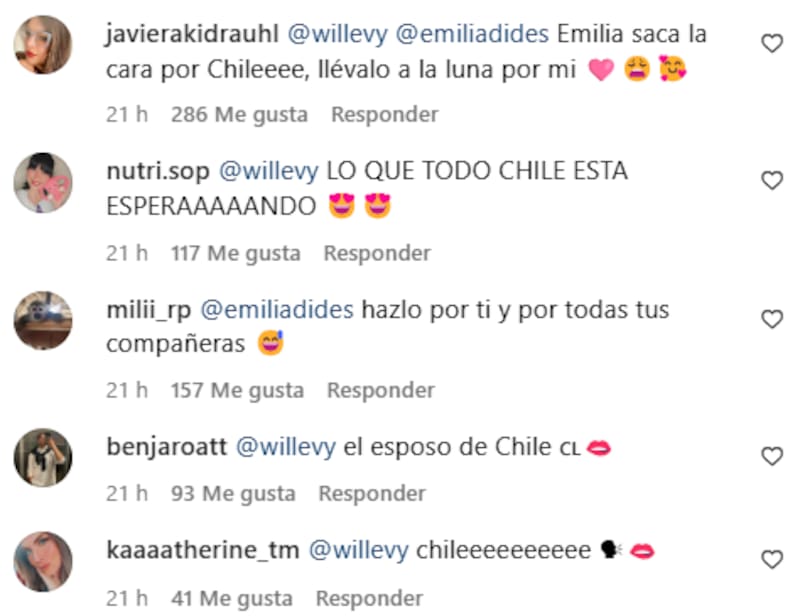 El histrión puso un emoji guiñando un ojo y un reloj de arena, en una de las publicaciones de la chilena, a lo que sus seguidoras inmediatamente le escribieron a modo de arenga: “Lo que todo Chile está esperando”, “Hazlo por ti y por todas tus compañeras”, “Saca la cara por Chile, llévalo a la luna por mí” y “El esposo de Chile”.