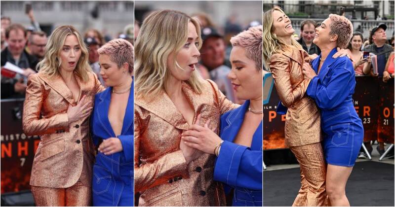La actriz estaba en plena promoción de la película Oppenheimer, cuando sin querer protagonizó un video viral. Su colega Florence Pugh la ayudó altiro.