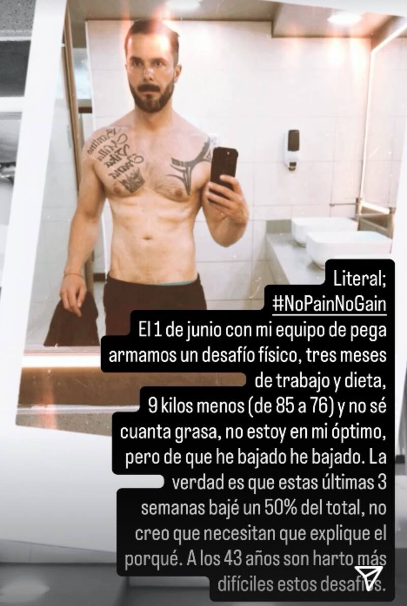 “9 kilos menos (de 85 a 76) y no sé cuanta grasa, no estoy en mi óptimo, pero de que he bajado, he bajado”. añadió, en una publicación que compartió a través de Instagram.