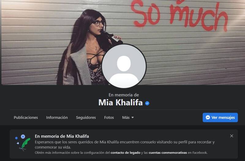 La confusión se apoderó de los seguidores de Mía Khalifa en Facebook cuando su perfil dejó de estar disponible para comentarios y pasó a ser uno de carácter conmemorativo. Al entrar al perfil de la exactriz pornográfica se podía leer lo siguiente: “Esperamos que este sea un lugar en el que amigos y familiares de Mía Khalifa puedan recordarla y rendirle homenaje”.