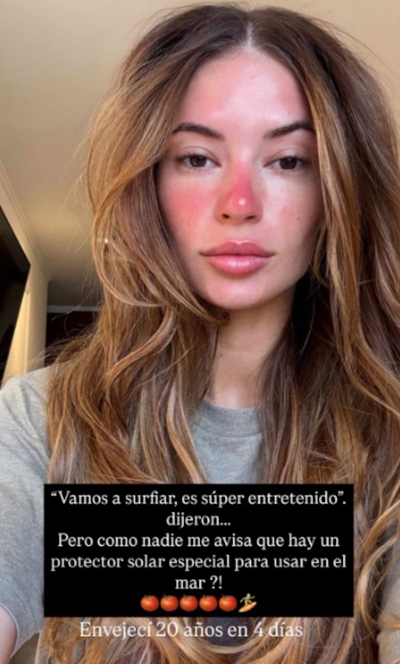 Luego, en un video que publicó, la brasileña mostró los productos que estaba utilizando para cuidar su piel tras las quemaduras por el sol. “Hola, mis amores, como pueden ver, yo soy casi un tomate, me quemé muchísimo en la playa”, explicó Julia.