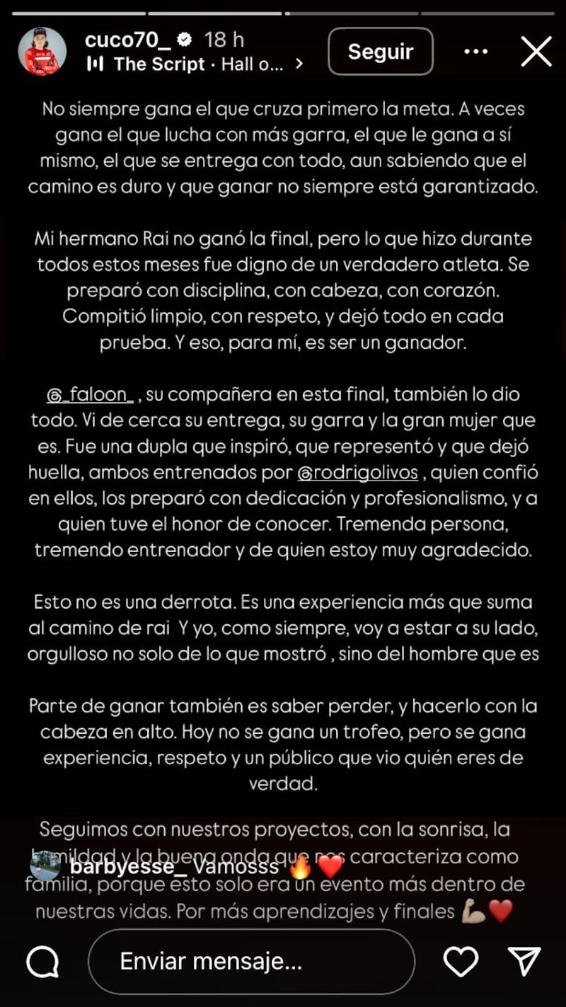 “Mi hermano Rai no ganó la final, pero lo que hizo durante todos estos meses fue digno de un verdadero atleta. Se preparó con disciplina, con cabeza, con corazón. Compitió limpio, con respeto y dejó todo en cada prueba. Y eso, para mí, es ser un ganador”, añadió.