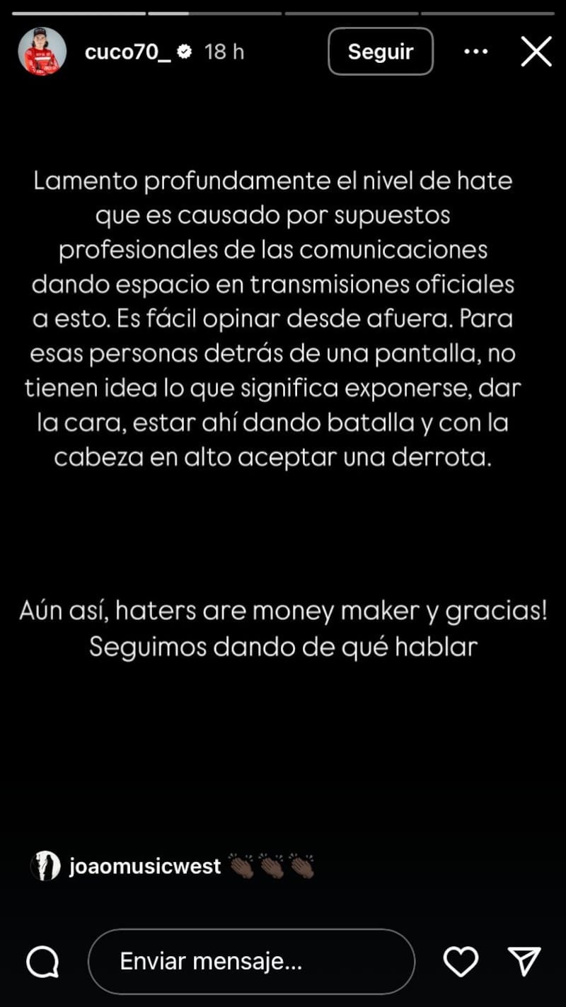 “Lamento profundamente el nivel de hate que es causado por supuestos profesionales de las comunicaciones, dando espacio en transmisiones oficiales a esto. Es fácil opinar desde afuera”, expresó José Manuel en sus historias de Instagram.
