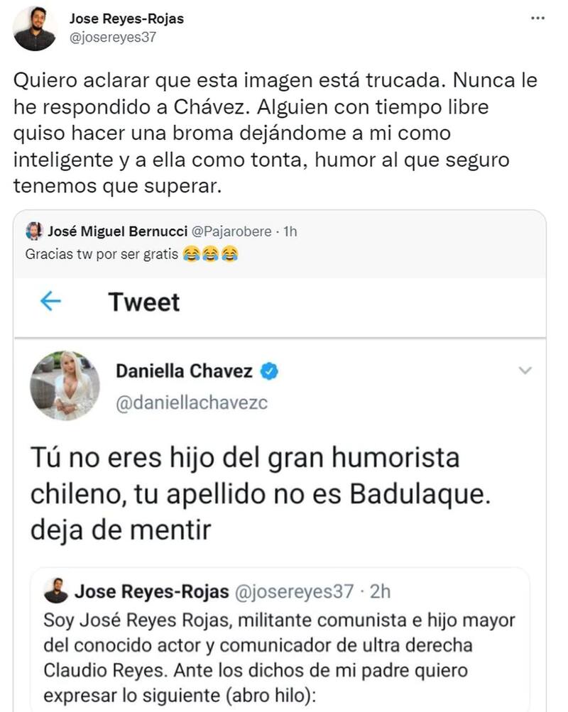 “Tú no eres hijo del gran humorista chileno, tu apellido no es Badulaque, deja de mentir”, rezaba supuesto tuit de la ex Conejita Playboy, el cual resultó ser falso.