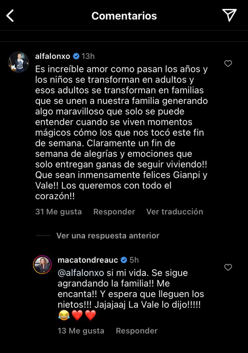 Macarena le respondió el tierno mensaje a su pareja en los comentarios de la publicación. “Sí, mi vida. Se sigue agrandando la familia. Me encanta! Y espera que lleguen los nietos. Jajaja la Vale lo dijo”, bromeó.