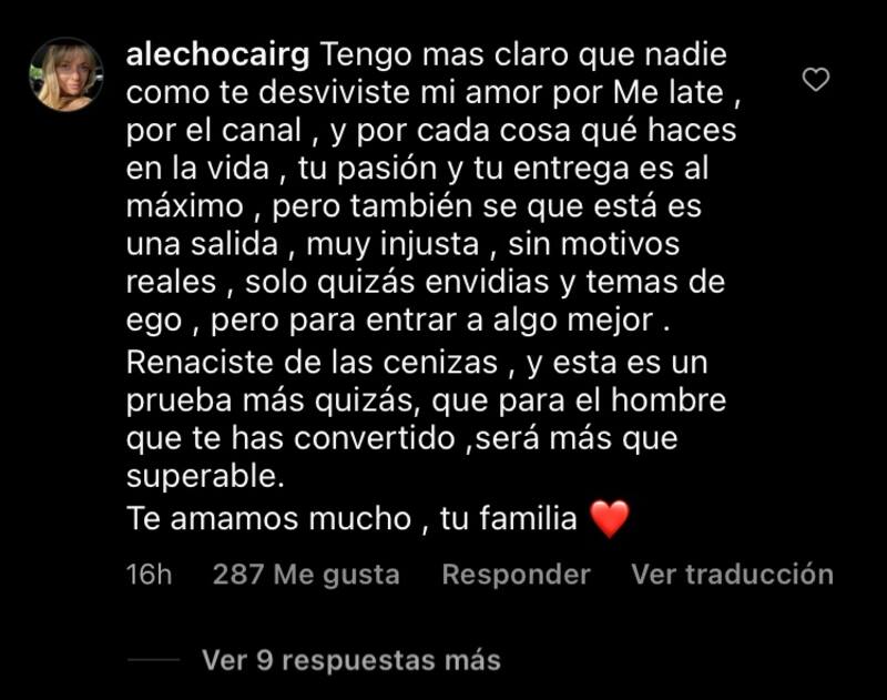 En esa misma línea, agregó que “tu pasión y tu entrega son al máximo, pero también sé que esta es una salida muy injusta, sin motivos reales, solo quizás envidias y temas de ego, pero para entrar a algo mejor”.