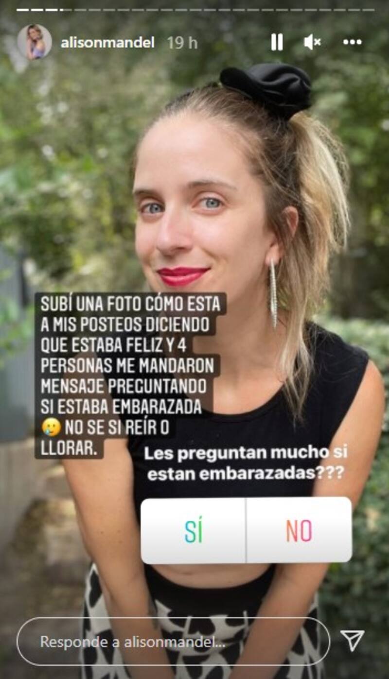 “Subí una foto como esta a mis posteos diciendo que estaba feliz y 4 personas me mandaron mensaje preguntando si estaba embarazada. No sé si reír o llorar”, detalló Mandel.