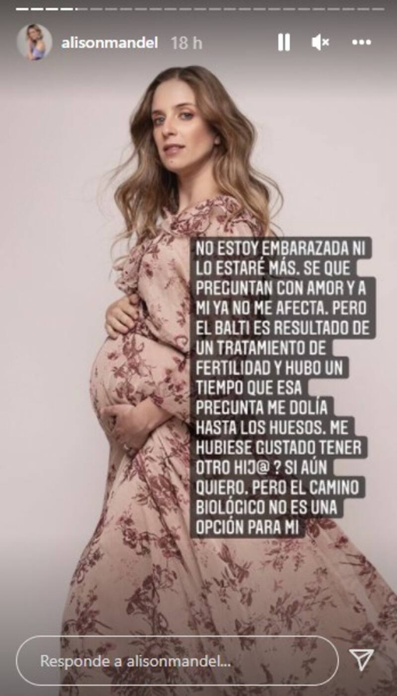 “No estoy embarazada ni lo estaré más. Sé que preguntan con amor y a mí ya no me afecta, pero el Balti es resultado de un tratamiento de fertilidad y hubo un tiempo que esa pregunta me dolía hasta los huesos”, expresó refiriéndose al nacimiento de su hijo junto a Pedro Ruminot.