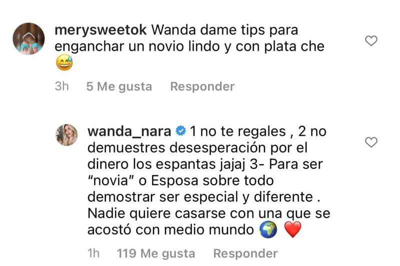 Incluso, se animó a darle consejos a una usuaria que le preguntó cómo “engancharme un novio lindo y con plata, che”. La modelo le recetó: “1. No te regales. 2. No muestres desesperación por el dinero, los espantás jajaja. 3. Para ser ‘novia’ o esposa sobre todo demostrar ser especial y diferente. Nadie quiere casarse con una que se acostó con medio mundo”.