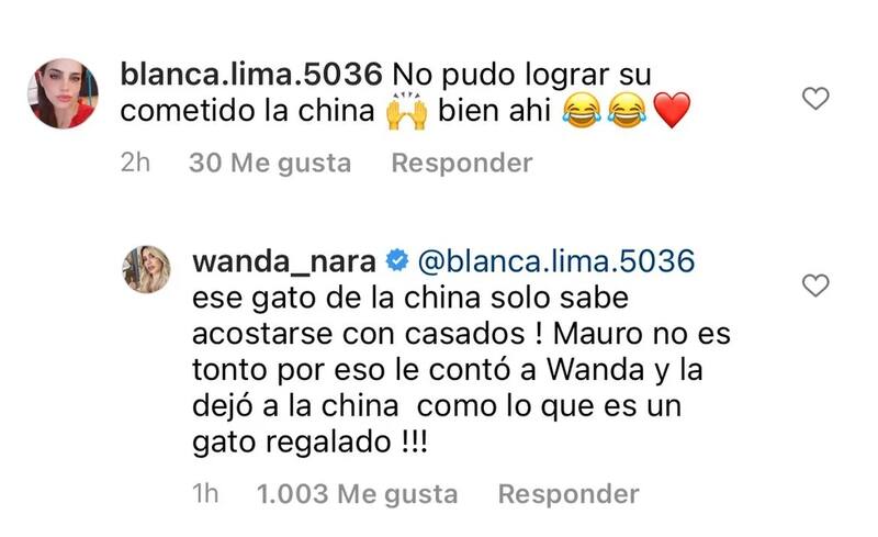 “¡Ese gato de la China solo sabe acostarse con casados! Mauro no es tonto, por eso le contó a Wanda y la dejó a la China como lo que es, un gato regalado”, escribió por ejemplo la esposa y representante de Icardi, contestando el mensaje de una seguidora.