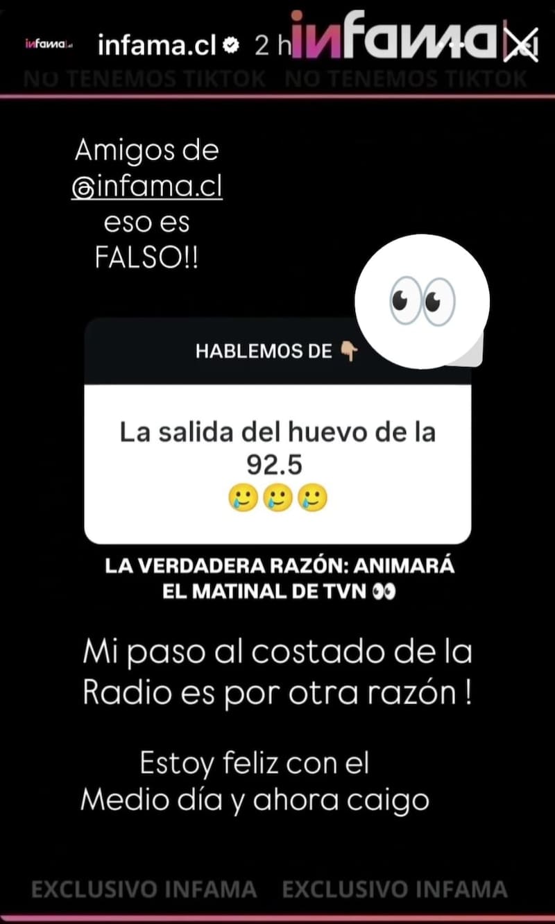 Sin embargo, fue el propio Fuenzalida quien se encargó de desmentir los rumores. Usando las historias de Instagram, el comunicador compartió el posteo de Infama y señaló: “Eso es falso”.