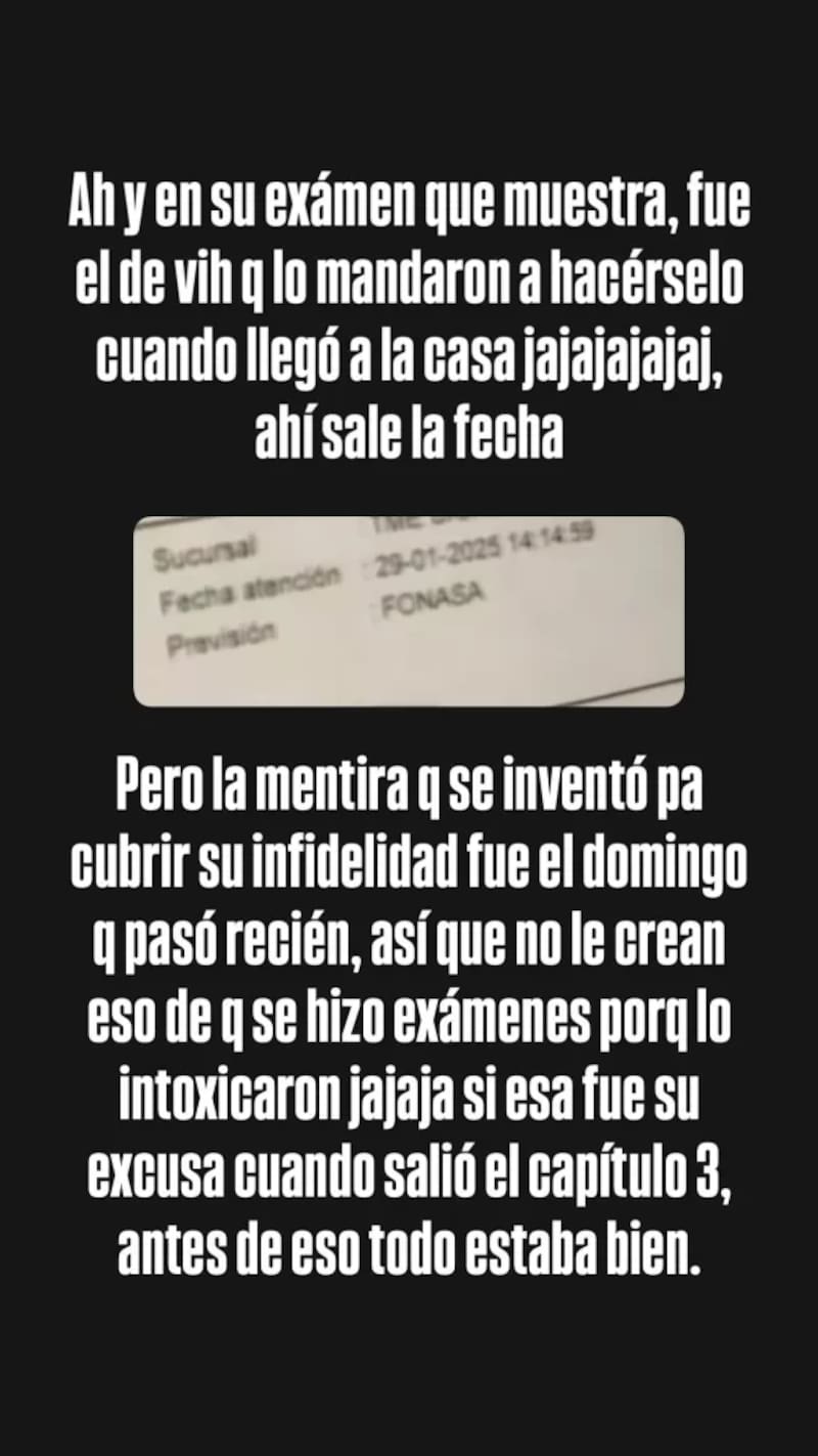 “Pero la mentira que se inventó para cubrir su infidelidad fue el domingo que pasó recién, así que no le crean eso de que se hizo exámenes porque lo intoxicaron. Si esa fue su excusa cuando salió el capítulo 3, antes de eso todo estaba bien”, cerró.