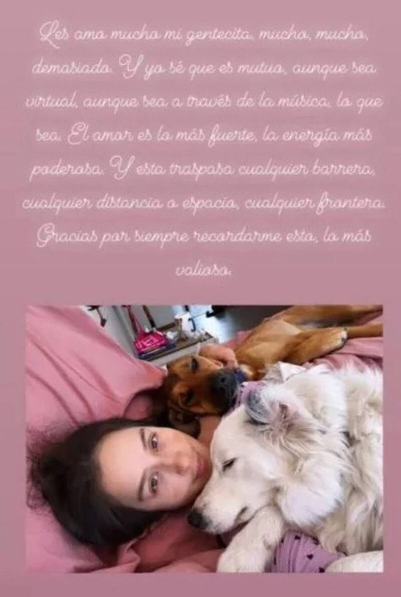 “Les amo mucho mi gente. Mucho, mucho, demasiado, y yo sé que es mutuo. Aunque sea virtual, aunque sea a través de la música, lo que sea”, escribió la artista nacional en su cuenta de Instagram.