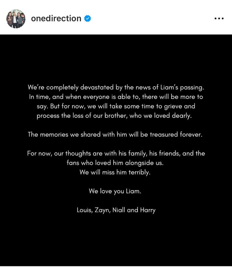 “Estamos completamente devastados por la noticia de la muerte de Liam. Con el tiempo, y cuando todos pueda, habrá más que decir”, comenzaron su declaración conjunta publicada en Instagram.