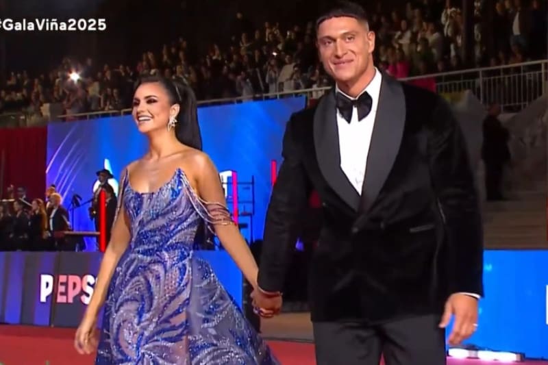 En la tradicional alfombra roja del Festival de Viña, Sammis lució un elegante traje de dos piezas con una humita. Detrás de él, apareció Emilia con un espectacular vestido con brillos y detalles en azul y blanco.