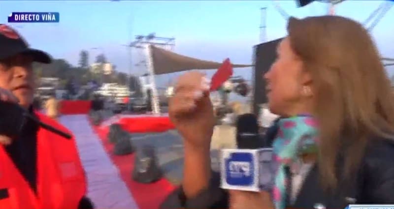 Mientras despachaba en vivo para Mucho Gusto, una trabajadora de la seguridad privada la invitó a retirarse del lugar. A ella y a Andrés Caniulef, quienes despachaban desde la misma alfombra y conversaban con su colega de TVN, Gino Costa.