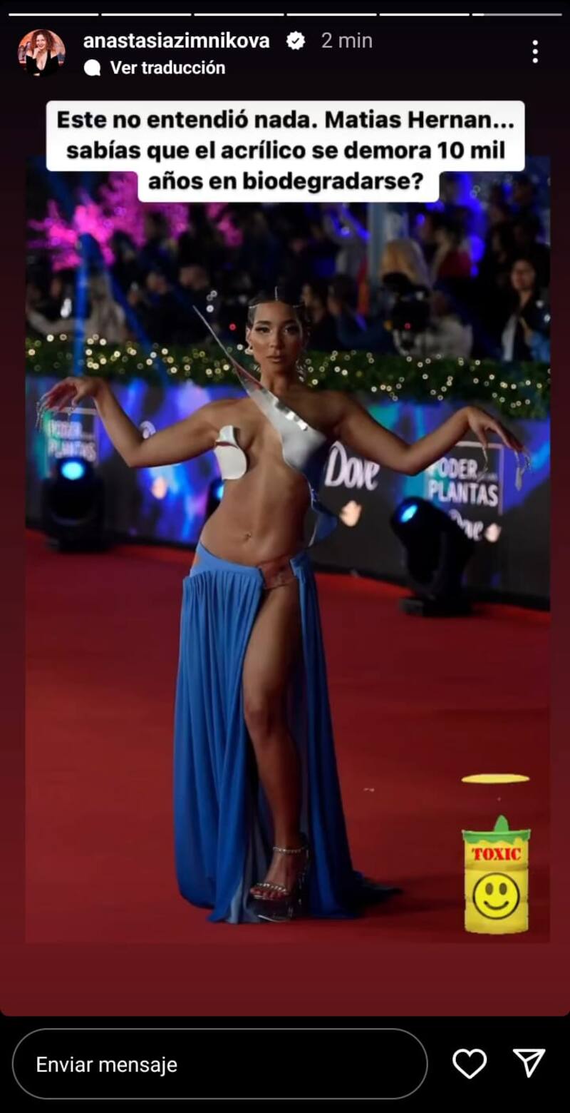 Sin embargo, Anastasia cuestionó el material del vestido y culpó al diseñador. “Este no entendió nada. Matías Hernán... ¿Sabías que el acrílico se demora 10 mil años en biodegradarse?”, cuestionó.