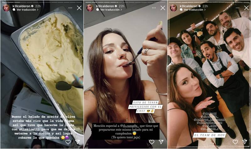 “Bueno, el helado de aceite de oliva estaba más rico que la vida misma. Así que tuve que hacerme la linda con Tissinetti para que me dejara meterme a la cocina y así logré robarme lo que quedaba”, escribió en una de las historias que compartió.