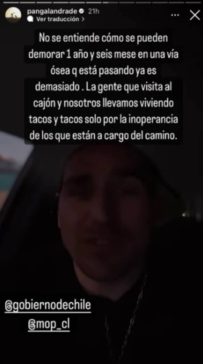“Nadie dice nada (...) llevan dos años, es una locura. Son tacos tremendos, está botado el Cajón y a nadie le importa”, afirmó etiquetando al Ministerio de Obras Públicas y al Gobierno de Chile con el propósito de lograr una solución respecto al problema.
