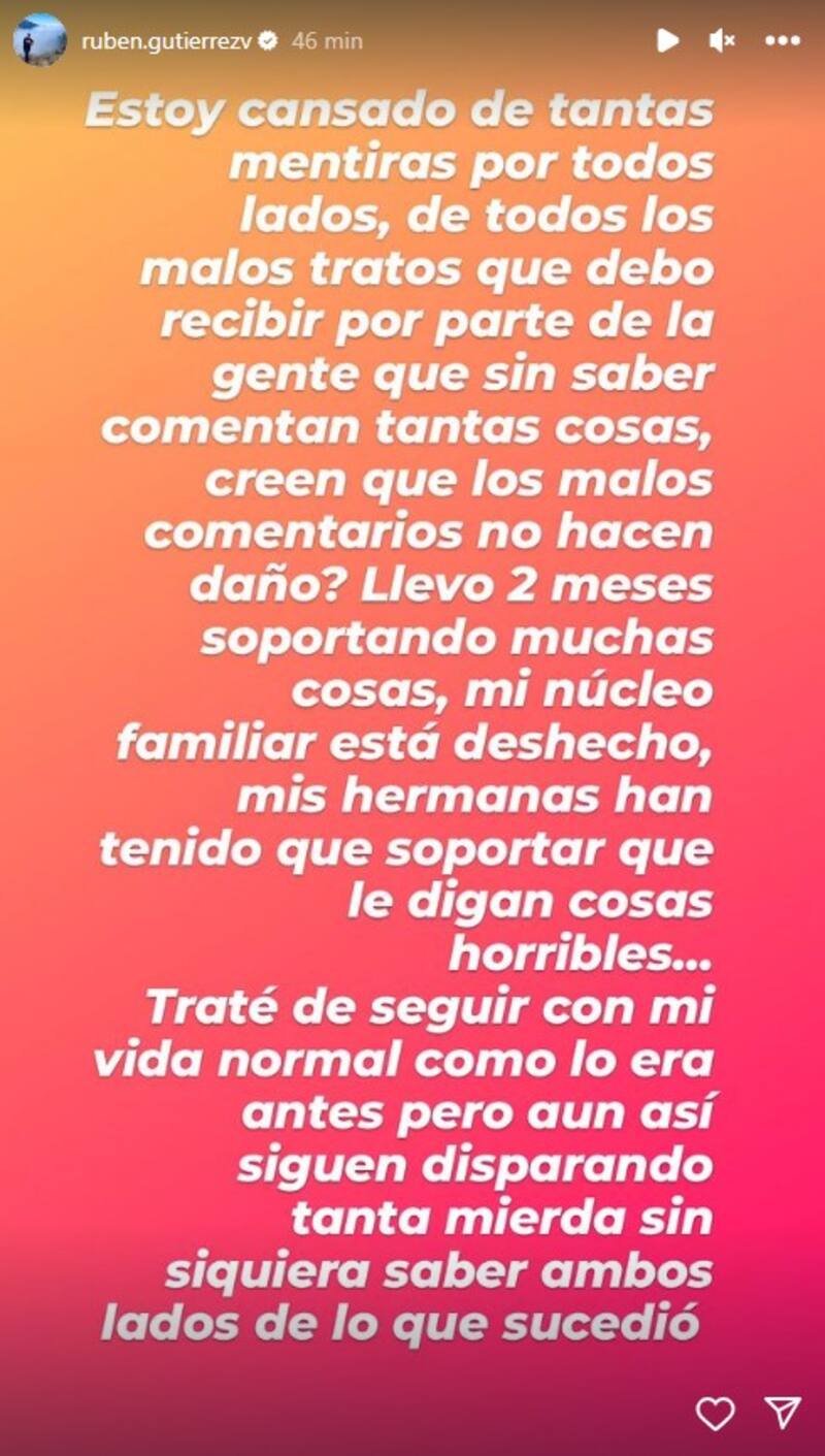 En su publicación, Gutiérrez denunció que lleva dos meses “soportando muchas cosas” y que el tema ha afectado a sus cercanos. “Mi núcleo familiar está desecho, mis hermanas han tenido que soportar que les digan cosas horribles”, acusó.