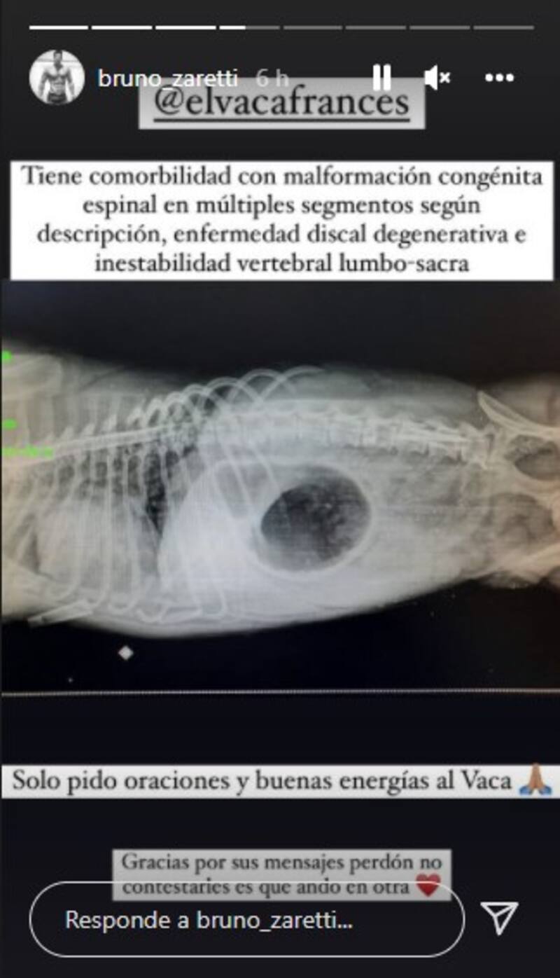 “Envíen sus buenas energías…” detalló en otro registro donde aparece acariciando y besando a su perrito, revelando posteriormente que sufrió una “comorbilidad con malformación congénita espinal en múltiples segmentos, una enfermedad discal degenerativa e inestabilidad vertebral lumbo-sacra”, pidiendo oraciones y agradeciendo el apoyo de sus seguidores.