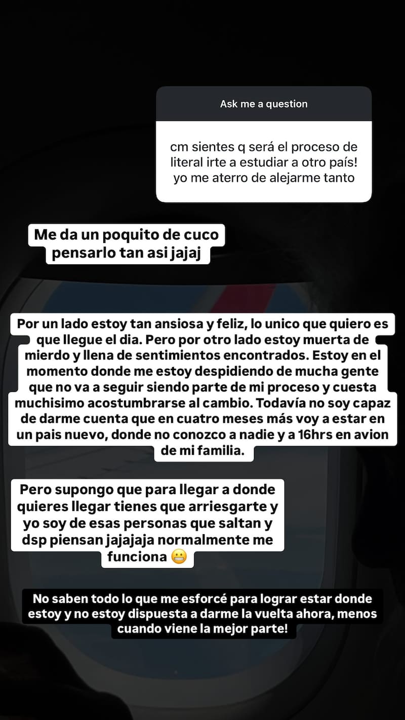 “Me da un poquito de cuco pensarlo tan así. Por un lado, estoy tan ansiosa y feliz, lo único que quiero es que llegue el día. Pero, por otro lado, estoy muerta de miedo y llena de sentimientos encontrados. Estoy en el momento donde me estoy despidiendo de mucha gente que no va a ser parte de mi proceso y cuesta muchísimo acostumbrarme al cambio”, reveló la joven con total honestidad.