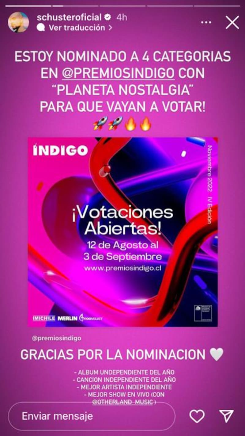 A través de sus historias de Instagram dio a conocer la gran noticia a sus seguidores. “Estoy nominado a 4 categorías en Premios Índigo con Planeta Nostalgia, para que vayan a votar”, señaló el artista.