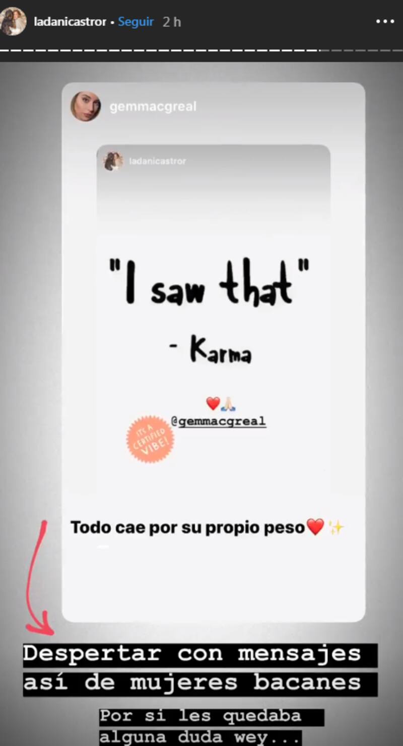 Y este apoyo que no quedó ajeno a Dani Castro, quien al rato volvió a compartir videos aclarando lo ocurrido. "Despertar con mensajes así de mujeres bacanes. Por si les quedaba alguna duda wey", escribió la cocinera.