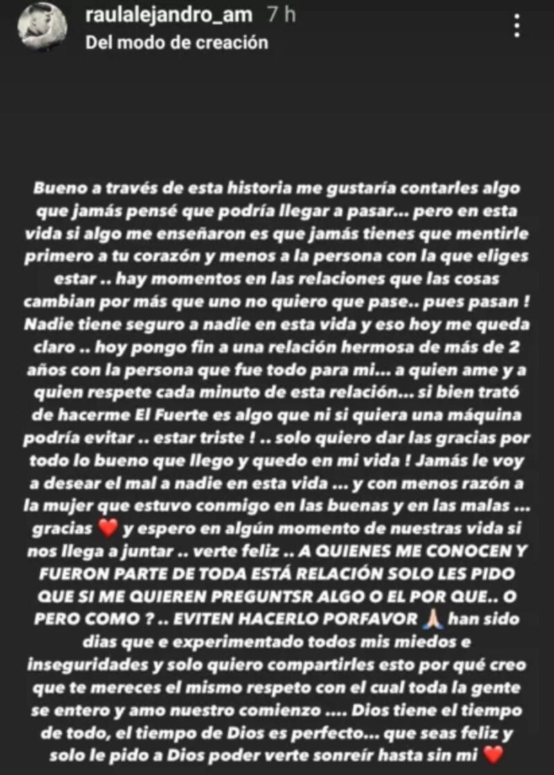 "Gracias, y espero en algún momento de nuestras vidas si nos llega a juntar… verte feliz", fue parte del texto que dedicó Raúl Alarcón a su ex.
