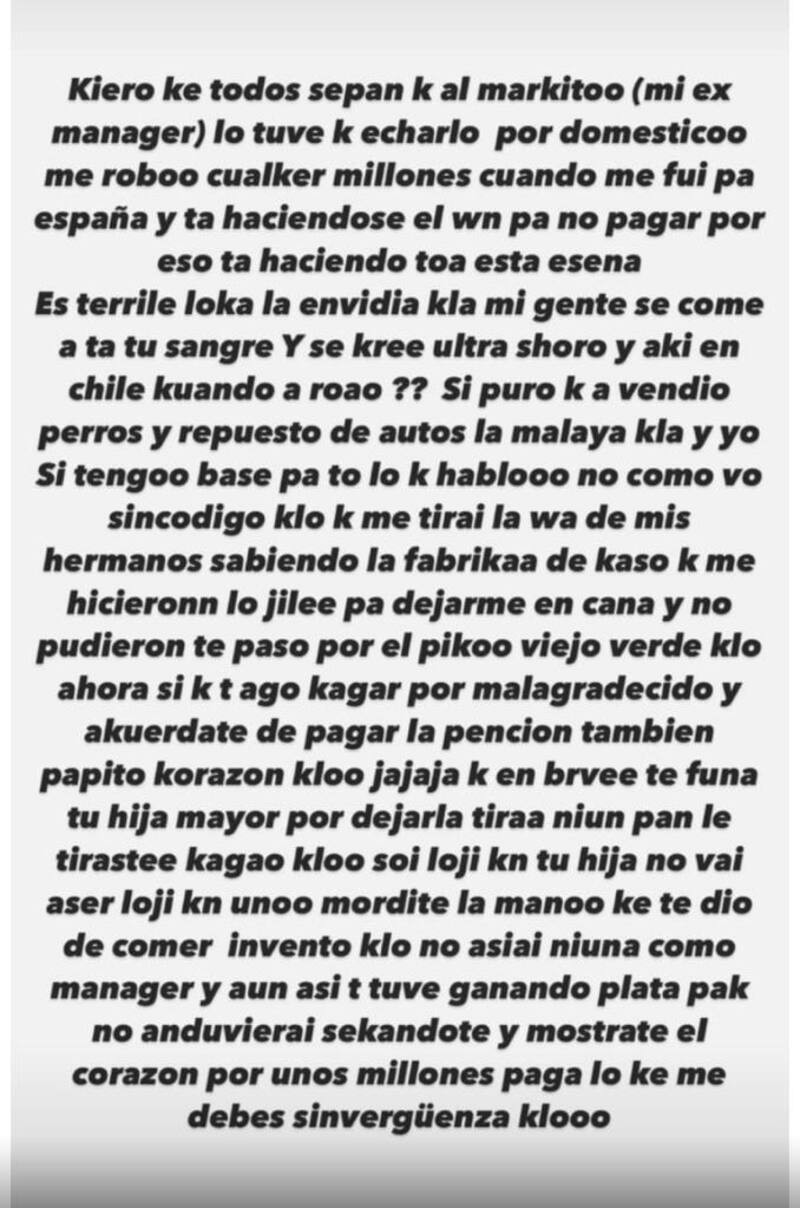 “Te voy a refrescar la memoria, una no eres la ficha del malenteo, nunca has robado, ni el cariño a tu madre. Estas ‘cogitiago’ en Argentina por mal hablado... en Antofagasta te cogotiaron’ y yo te recuperé tus cosas. Págale a tus trabajadores, que debes meses, págalo a los artistas los porcentajes, viste plata y te asustaste”, agregó.