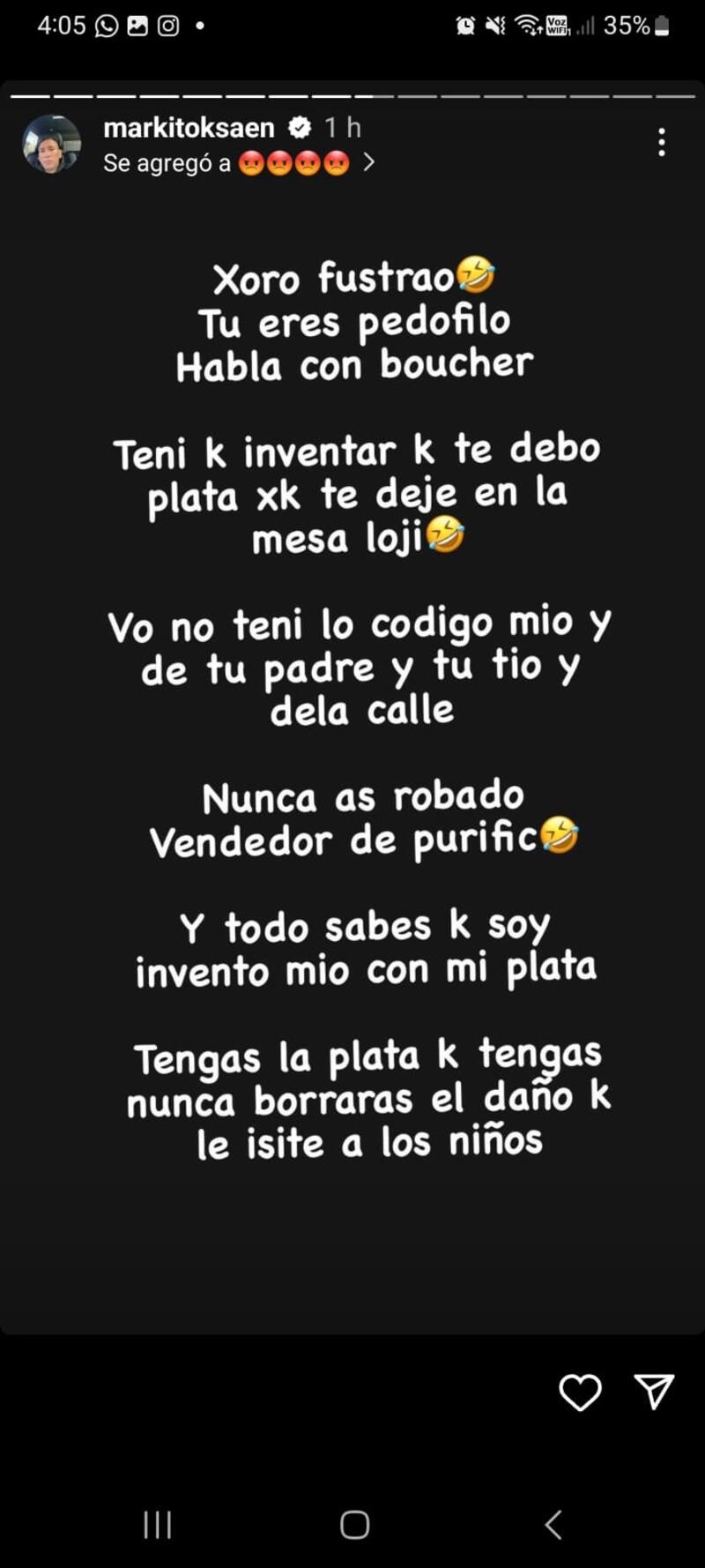 Ahí le mandó un mensaje a los seguidores. “Dejen de seguir al pedófilo que le sacaba fotos a sus propios hermanos sin ropa. Por eso tiene la causa, y su madre que se cree madre que lo dejó tirado a los 3 años le está tapando todo por que ahora tiene plata”, aseveró.
