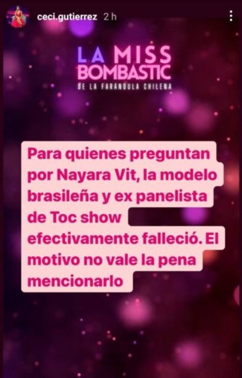 "Anoche recibí una triste noticia y no logré descansar nada (…) Luego habrá tiempo para analizar lo ocurrido, llorar y desahogarme. Una persona muy cercana partió. Solo pido que su familia hoy esté fuerte y se mantengan unidos", fue el primer indicio que entregó la modelo en su cuenta de Instagram.