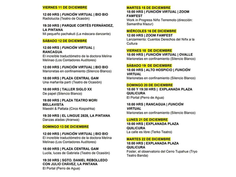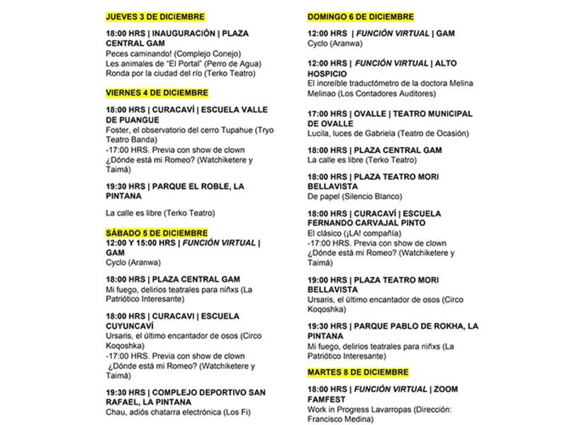 El evento contará con 16 montajes nacionales. El público podrá disfrutarlos en dos modalidades: Plataformas digitales y en recintos abiertos. Entre estos están el GAM, el Teatro Mori de Bellavista, el frontis del Teatro Municipal de La Pintana, y las plazas municipales de Curacaví y Quilicura.