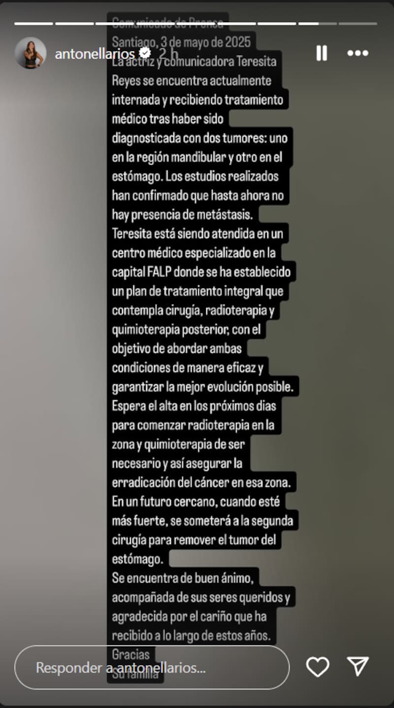 “Teresita Reyes se encuentra actualmente internada y recibiendo tratamiento médico tras haber sido diagnosticada con dos tumores: uno en la región mandibular y otro en el estómago", comienza el mensaje.